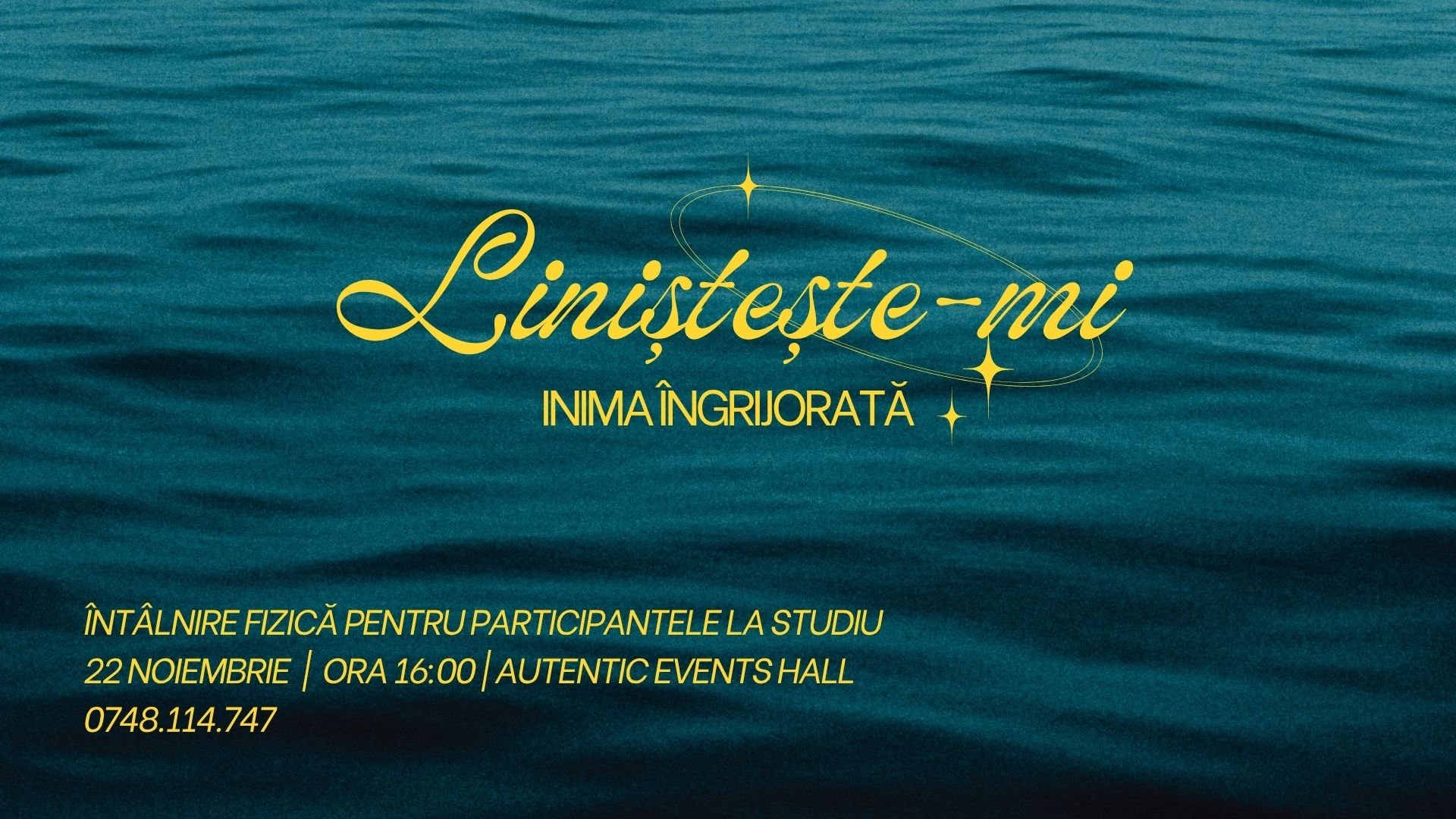 Dragi femei, vă invităm cu drag la o întâlnire specială dedicată participantelor la studiul „Doamne, liniștește-mi inima îngrijorată”, joi, 22 noiembrie, de la ora 16:00. Va fi un timp în care ne vom opri din ritmul zilnic, pentru a reflecta împreună la ceea ce Dumnezeu a lucrat în inimile noastre în ultimele săptămâni.